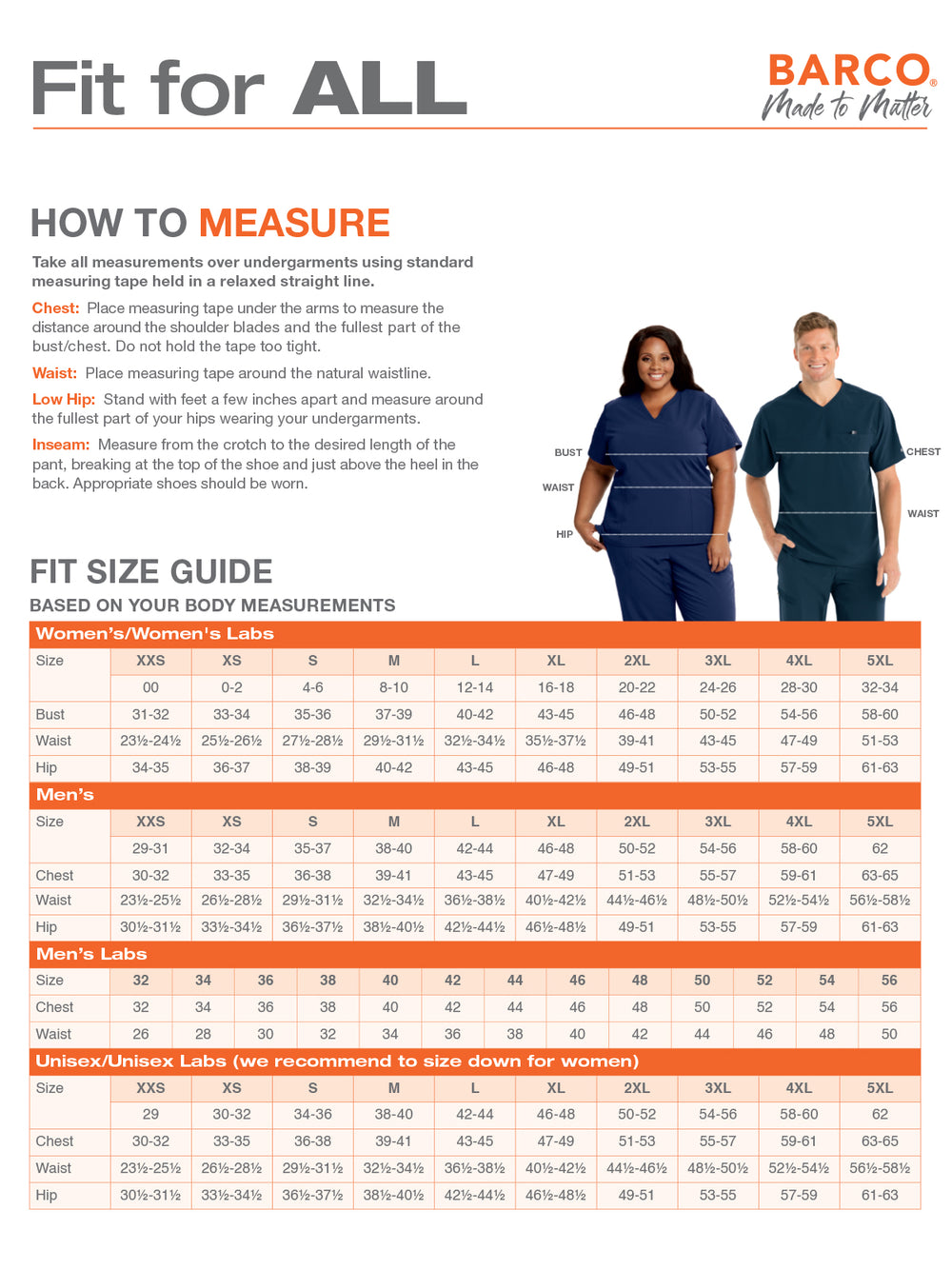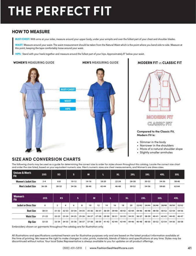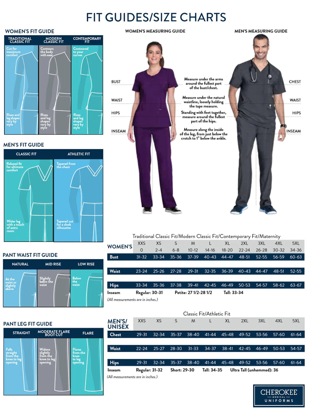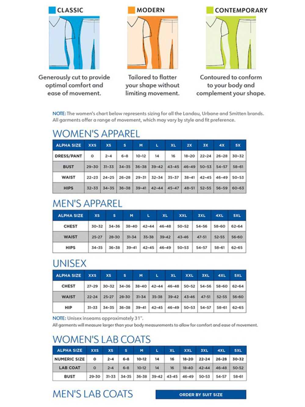 Similar to typical apparel, scrubs have unique fits based on the brand and the apparel collection. To help you determine which fit is best for you, please take a look at the fit types by brand to determine which is best for you, or reference the size charts below if you know your size and measurements already.
