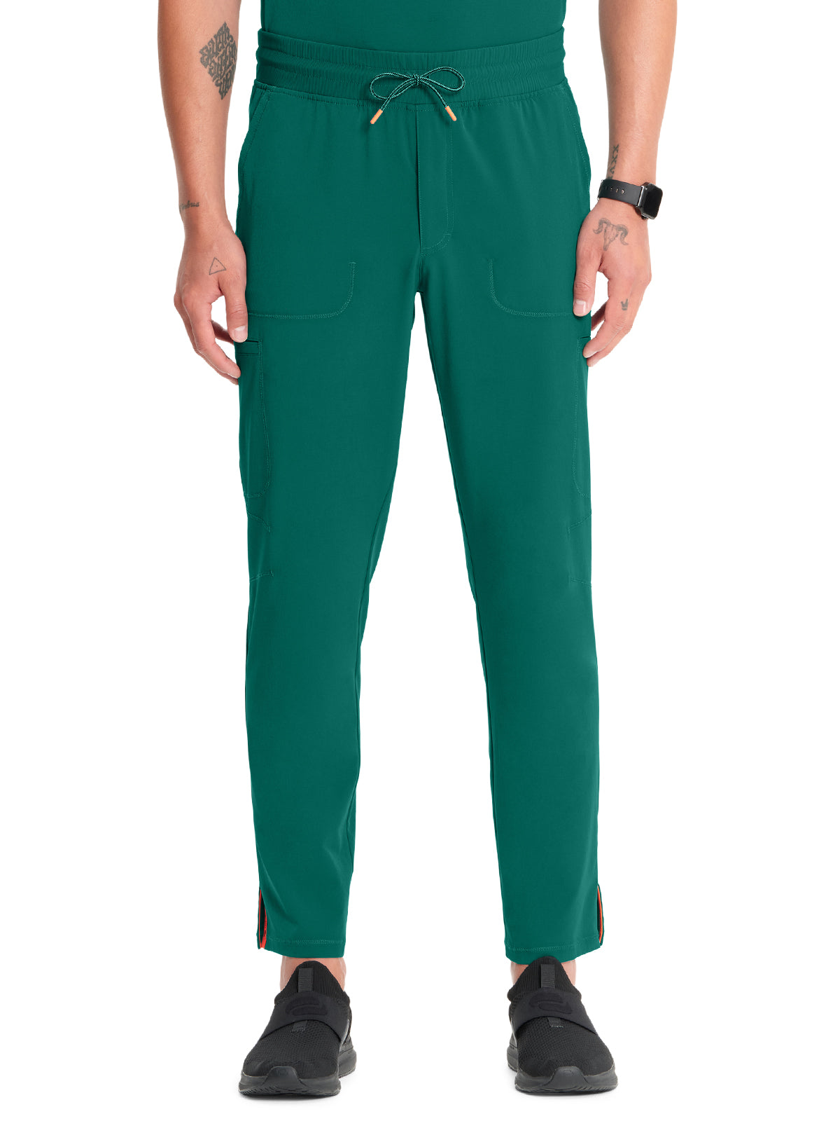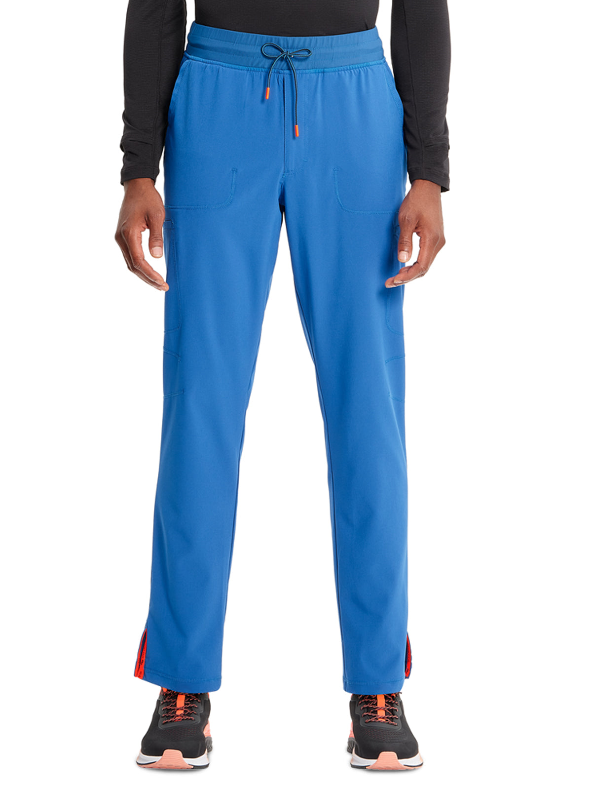 This Men's fit mid rise zip fly pant has a dyed-to-match rib-knit waistband reinforced with inside elastic and finished with a tipped drawstring. There are six pockets: two front pockets with dyed-to-match rib-knit insets at the corners, two welt cargo pockets, and two welt back pockets with signature contrast mesh pocket bags. Other features include knee darts and a curved back yoke seam. Side vents with logo twill tape lining complete this pant. Straight leg, 14" opening. Inseam 31"