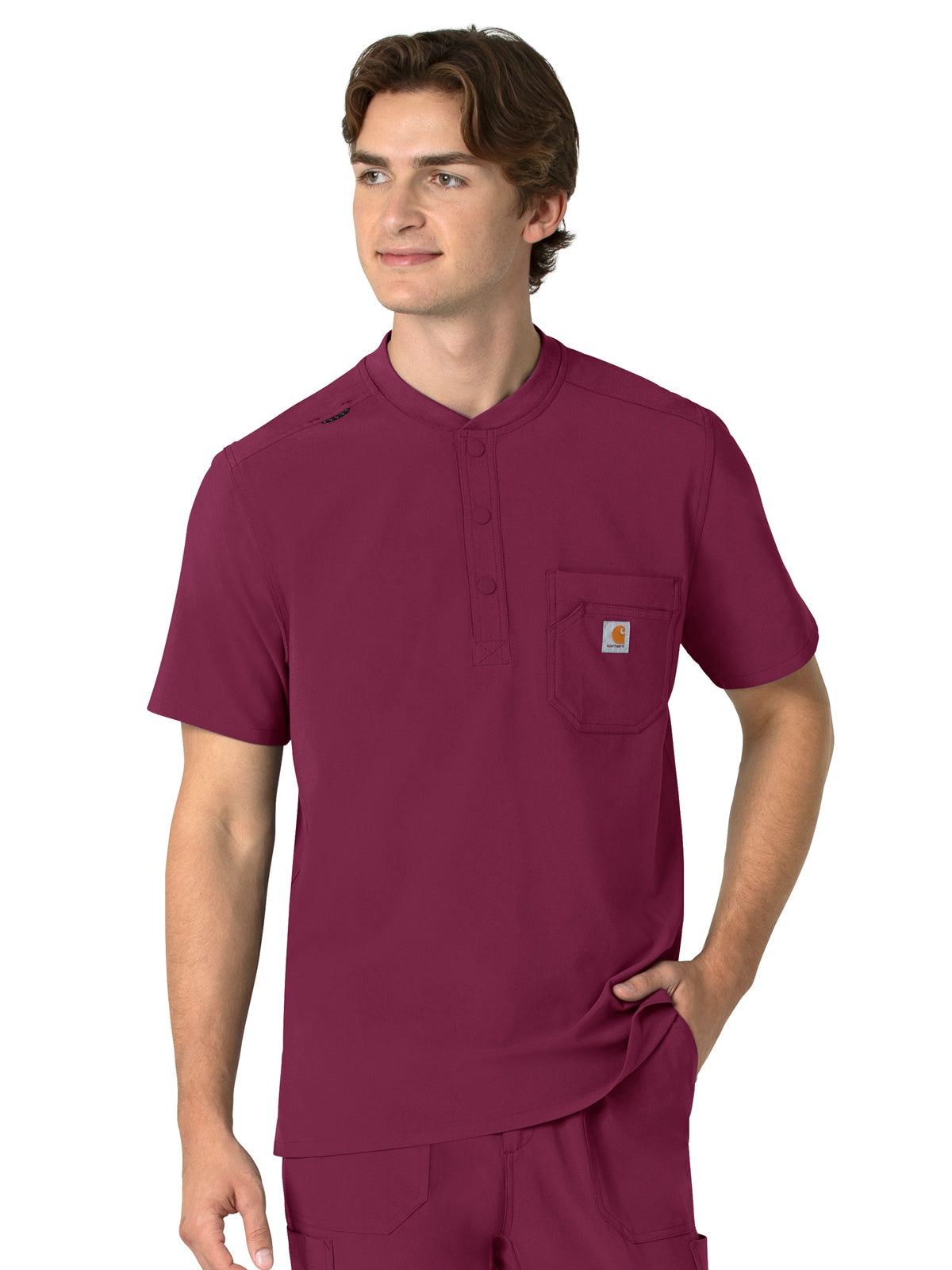 Getting dressed for work should give you the cool, calm confidence you need for a successful shift every time. That's where this men's Henley scrub top comes in, delivering plenty of comfort with essential utility. Store smaller items in the triple-stacked chest pocket, built with a hidden zipper for cleverly concealed storage. Keep your pen handy at all times in a dedicated slot for stay-put convenience. Display your badge on a shoulder loop so it's ready and visible when you need it but out of your way when you don't. Made from a stretchy material with micro ripstop, this scrub top takes care of durability for the long haul. Vents at the side hem let you move and bend with ease, while a snap-button placket accents the Henley neckline. Both classic and fresh, it gives you versatility in styling with a longer hem in the back to tuck in or leave relaxed.