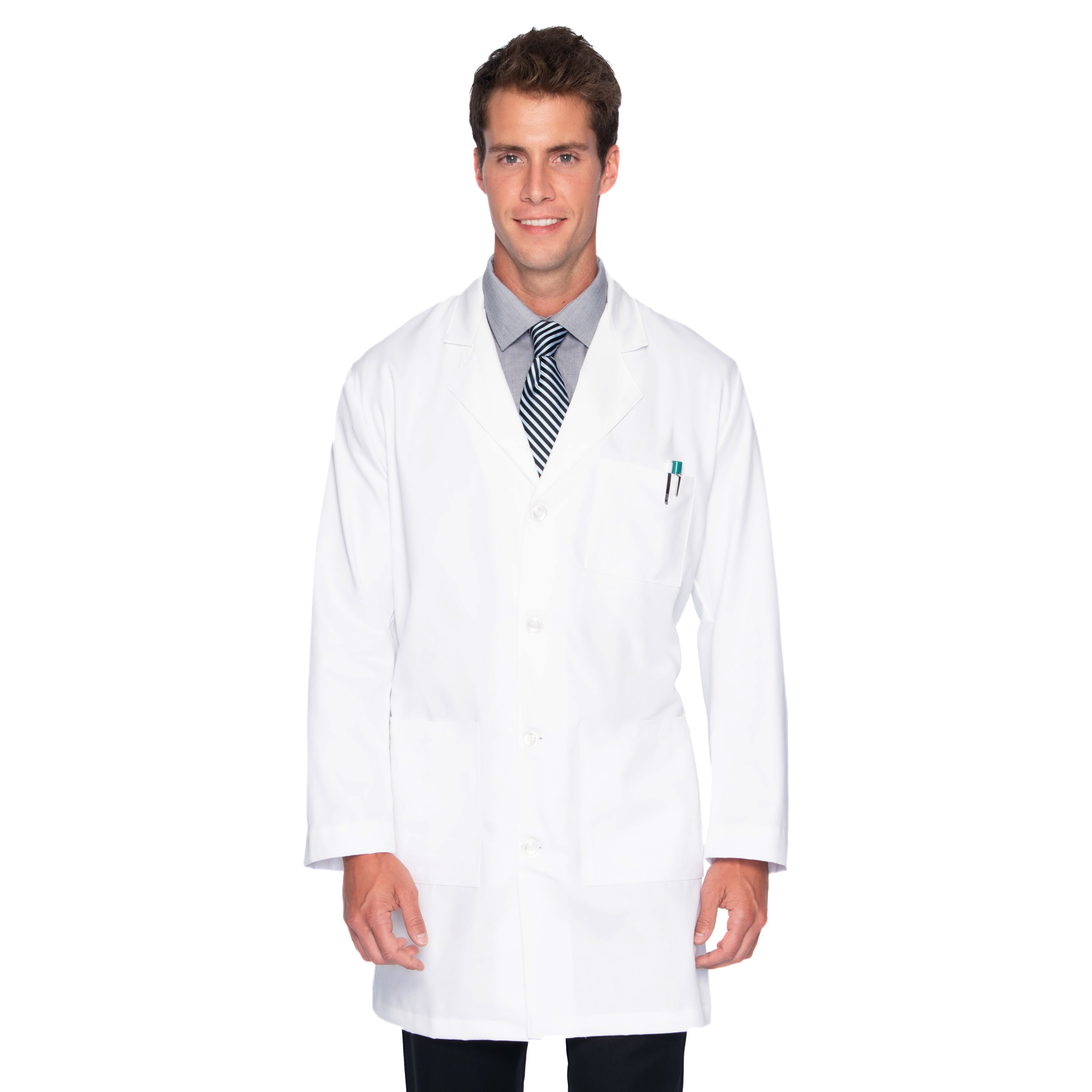 - Professional Work Wear: This full-length white lab coat for men features a professional notch collar, a four-button closure, flattering two-piece sleeves for a greater range of arm motion, back double pleats and an inset belt for a flattering shape, and a center back vent for extra ease of movement; Length: 36 7/8" (Size 40)