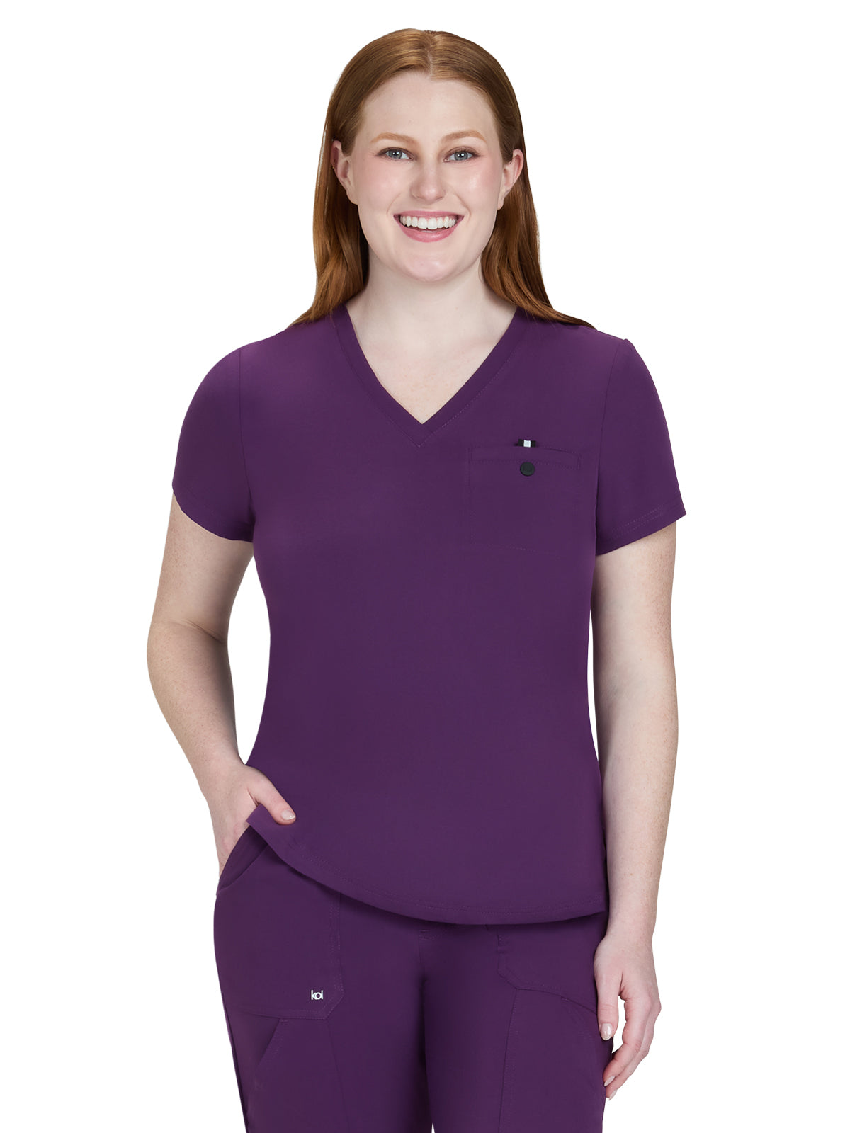 Prepare to fall in love with your new go-to scrub top! This contemporary v-neck top offers the perfect blend of comfort and style. The modern classic fit combined with 4-way stretch fabric ensures you'll look and feel your best throughout your busy day. The eye-catching contrast Foulard print and signature back tab detail add a touch of personality, while the welt pocket with a snap closure keeps your essentials secure. Breathable side slits enhance comfort and movement. With a length of 26 1/2 inches (size small), this top provides a flattering silhouette. Please note that this style tends to run slightly large, so consider sizing down for the perfect fit.