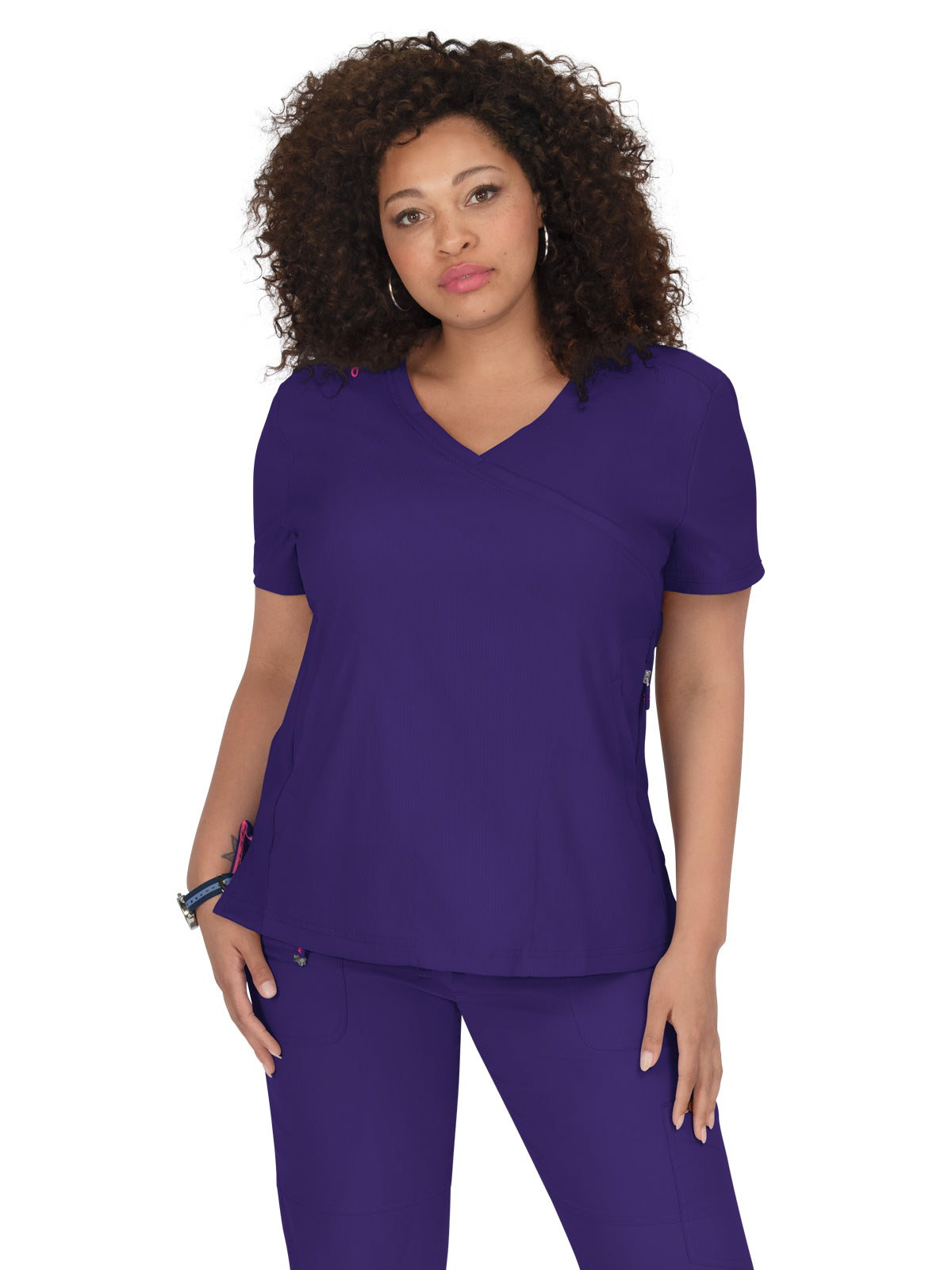 Stay comfortable and professional in this lightweight, durable mock-wrap top designed for the modern healthcare professional. The slim fit and performance stretch fabric offer a flattering silhouette while ensuring ease of movement throughout your busy day. Breathable and moisture-wicking, this top keeps you cool and dry, and the easy-care fabric is perfect for quick washes and wears. Convenient details include a bungee loop for your ID badge, two front pockets, and a secure side zipper pocket. The rib-knit trim on the sides adds a touch of style, while the zipper detail at the side of the waist provides a customizable fit. With a length of 26" in size Small, this top is a perfect blend of fashion and function.