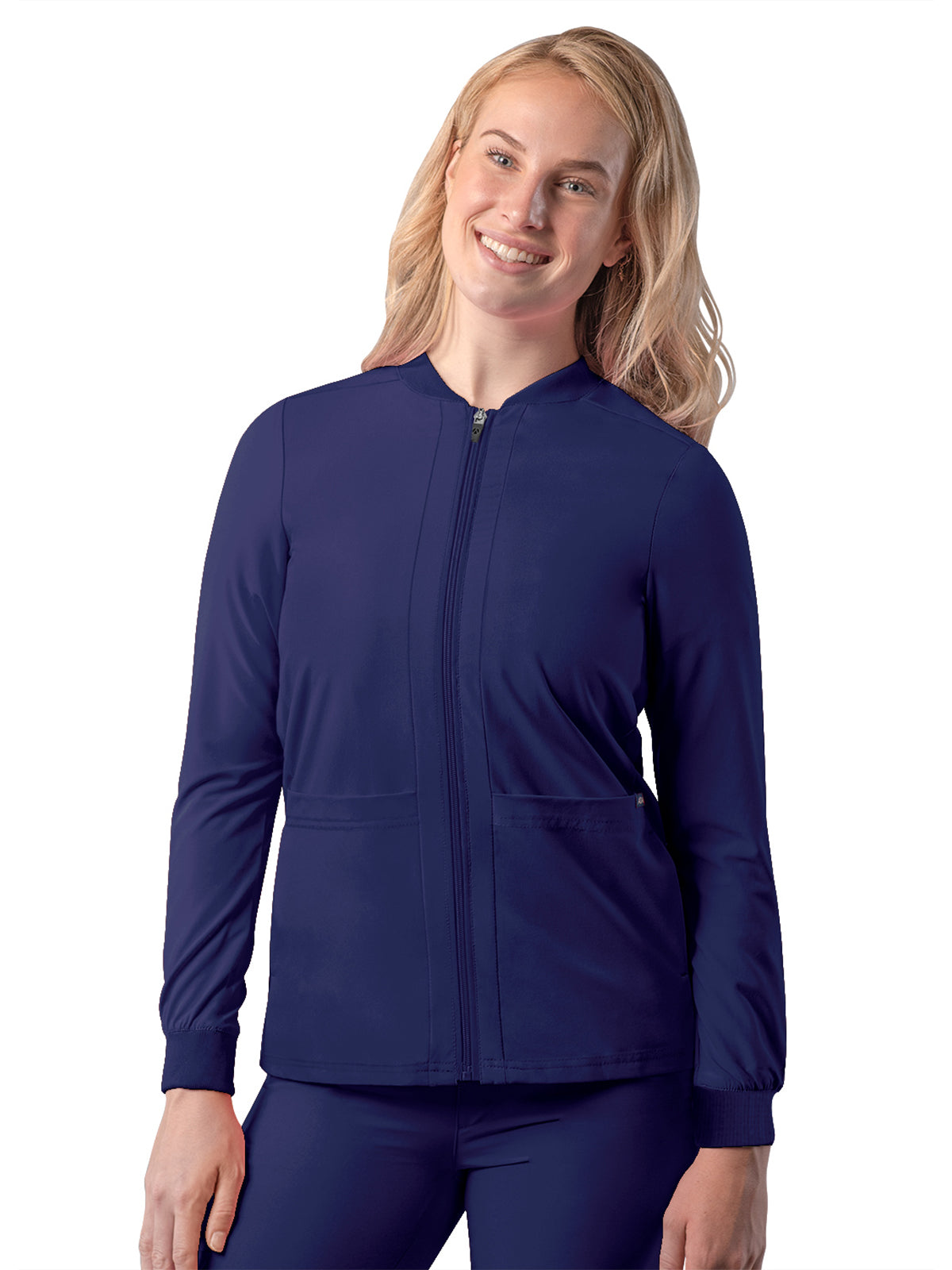 This women's bomber jacket features a self-lock branded zipper, four-way stretch fabric for limitless motion. It also features four pockets: two large top entry and two side entry. Double layer rib knit at the neck. Forward shoulder for a modern look. Woven label. Double layer rib knit at cuff. Center back length: 26".