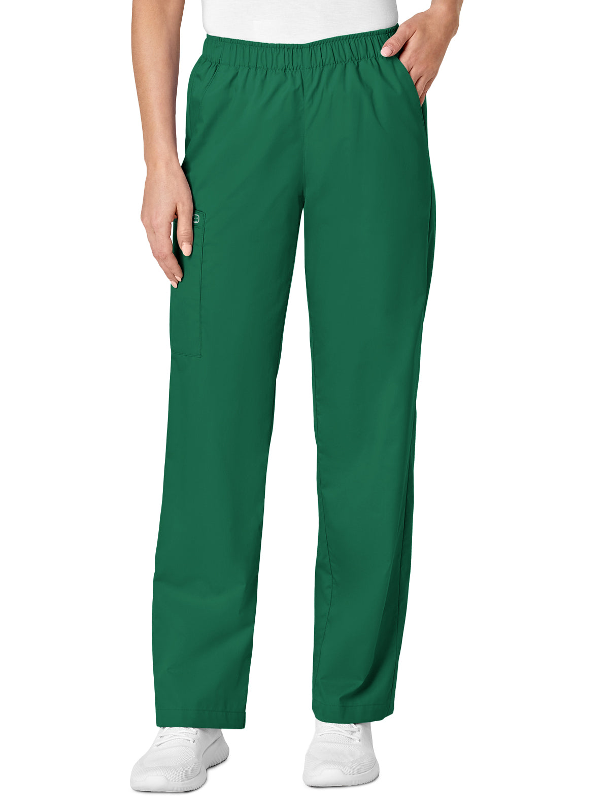 WonderWORK's Women's Pull-On Cargo Pant, featuring a full elastic waist, front rise slits just below the natural waist, with a higher back rise for added coverage. This straight leg pant includes two front slash pockets, one cargo pocket with a utility loop, one pen slot and one cell phone pocket.