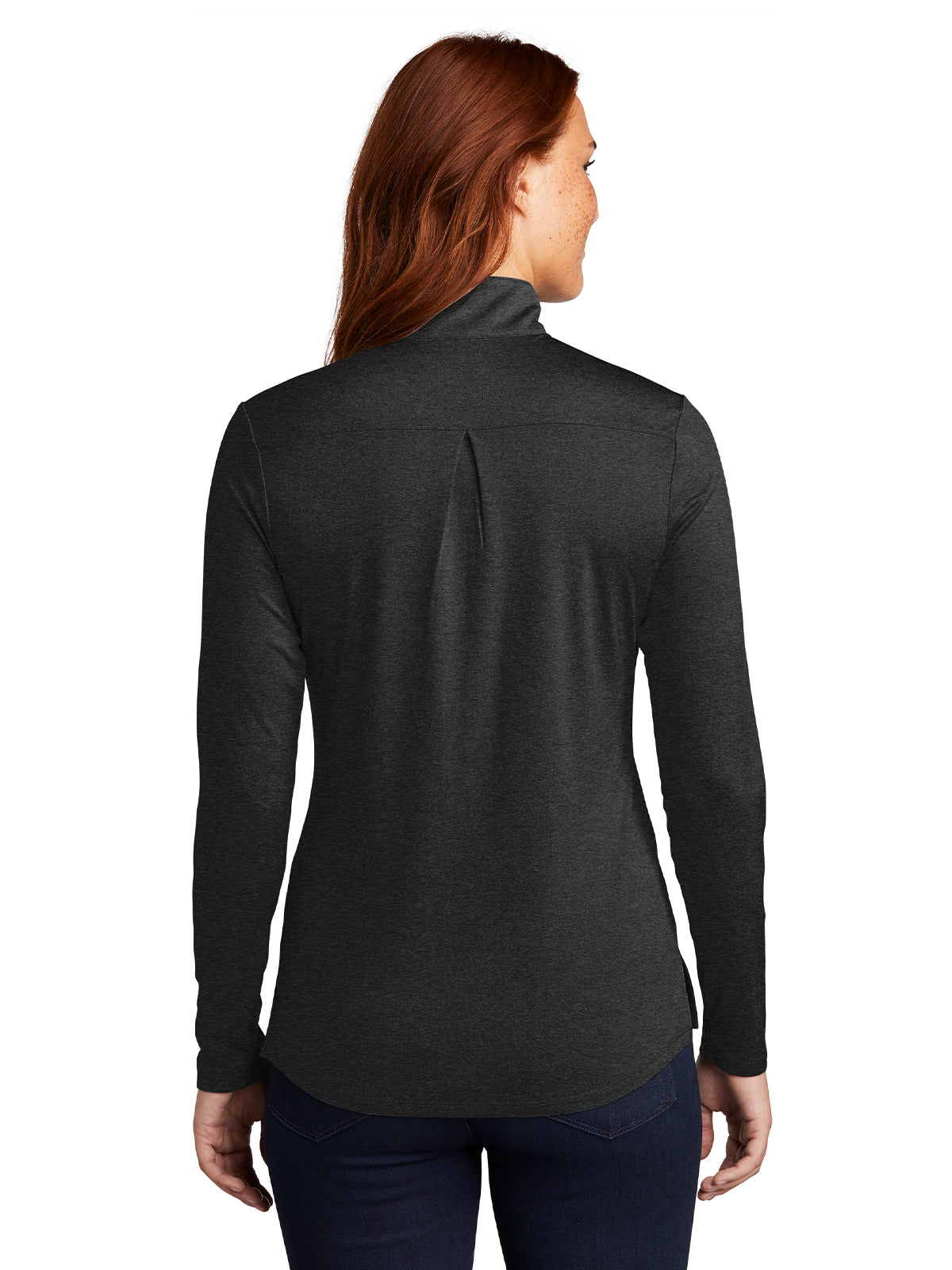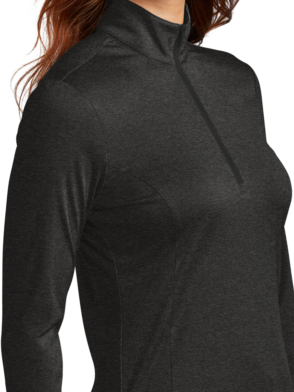 With a subtle heather texture and moisture-wicking technology, this ladies lightweight polyester 1/2-zip will help you achieve all your performance endeavors. Features include a tag-free label, princess seams, extended side vents, a back yoke with a pleat, and a drop tail rounded hem. Center back length: 27 1/2" (Medium)