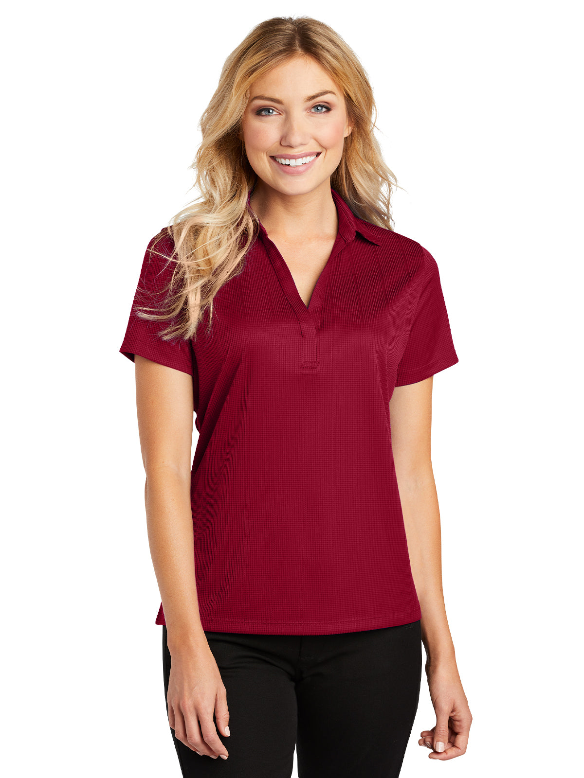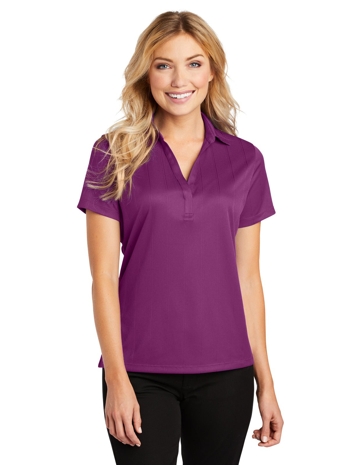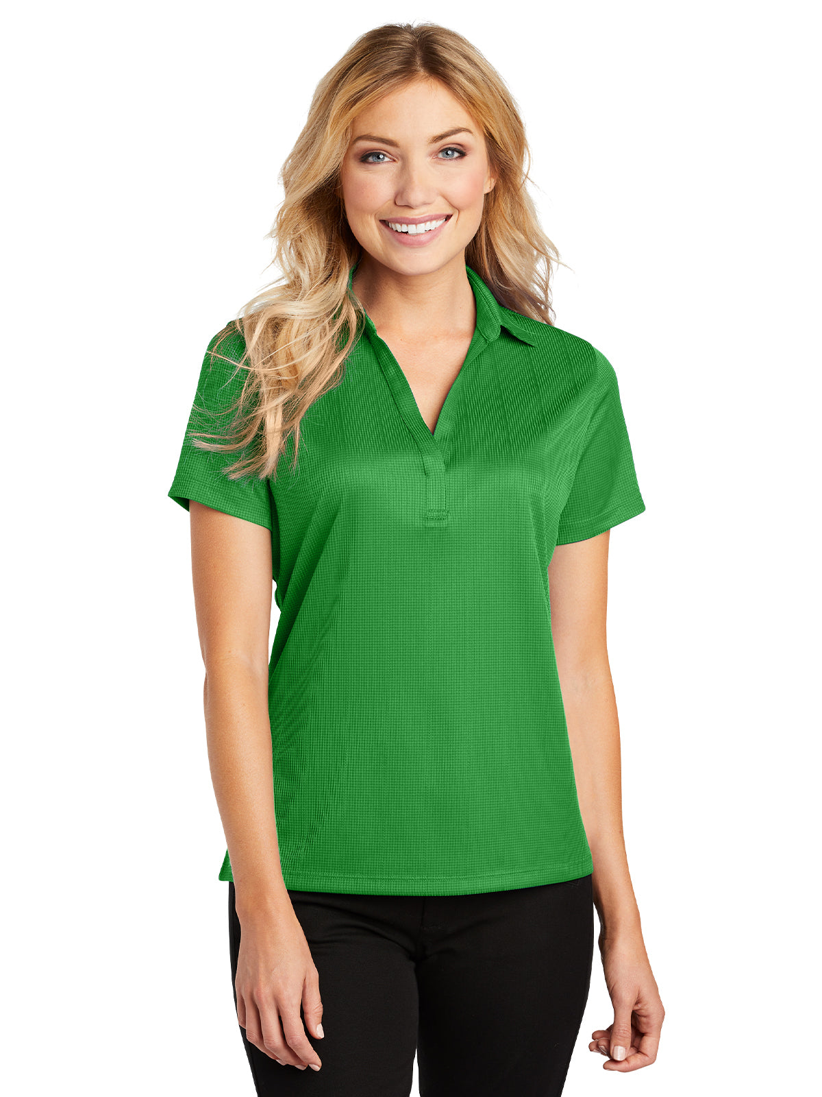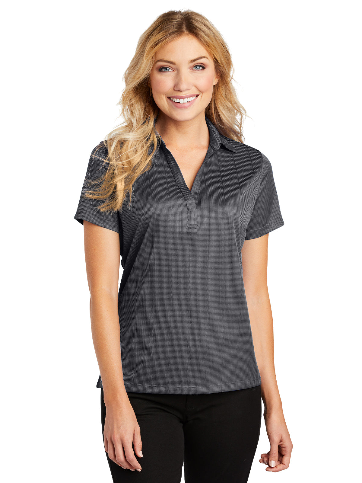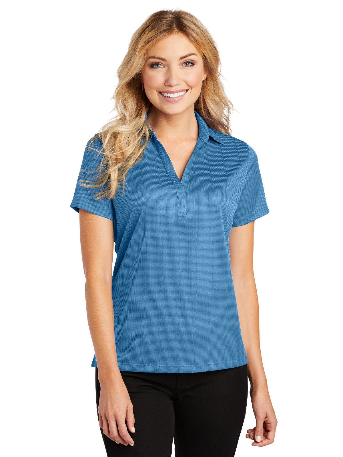 Lightweight and breathable this moisture-wicking shirt has a pleasing drape subtle jacquard texture and an open placket for feminine style. 4.1-ounce 100% polyester. Self-fabric collar Open hem sleeves. Due to the nature of 100% polyester performance fabrics special care must be taken throughout the screen printing process.