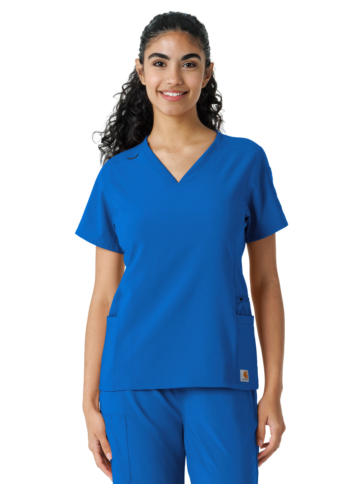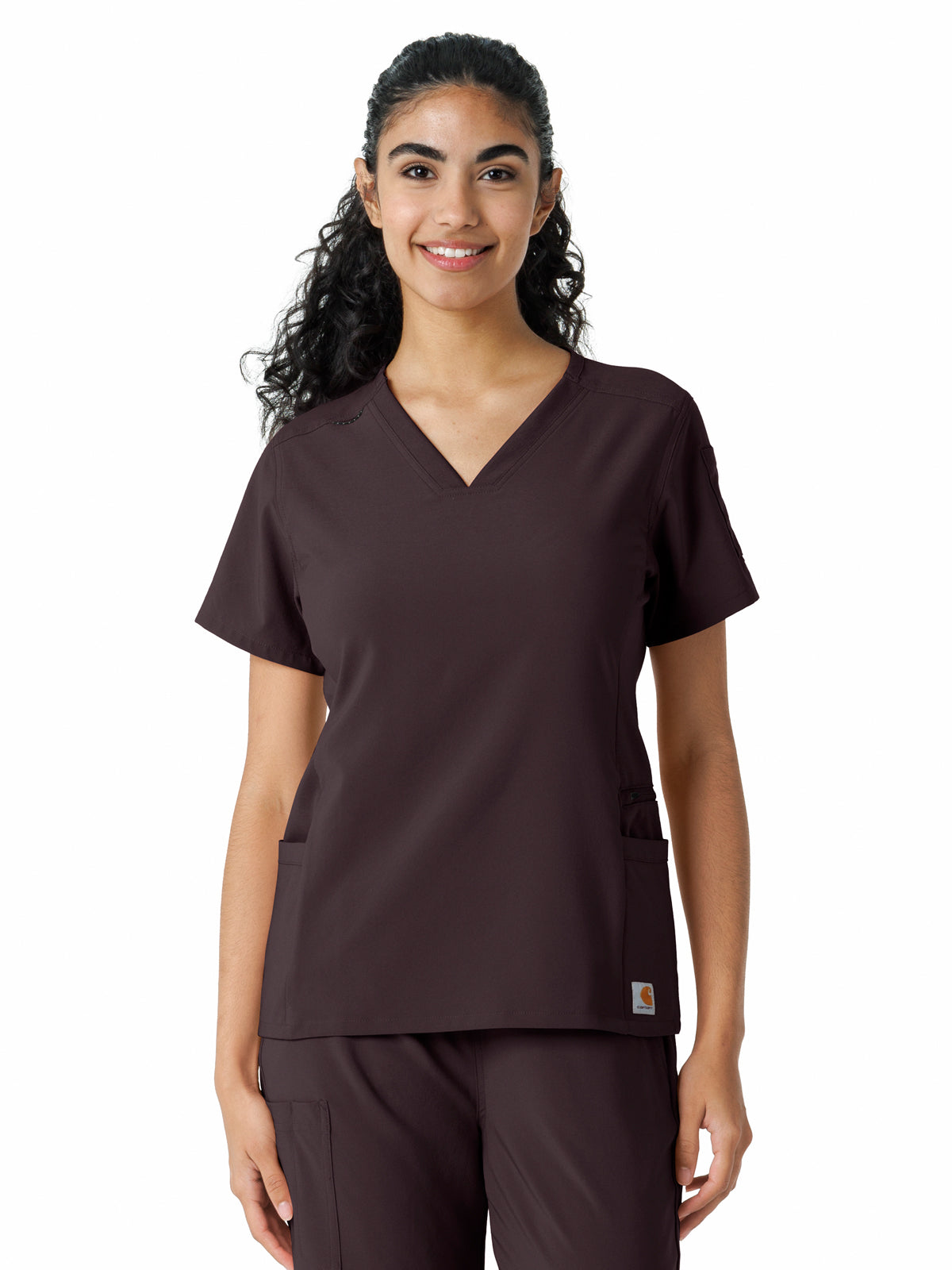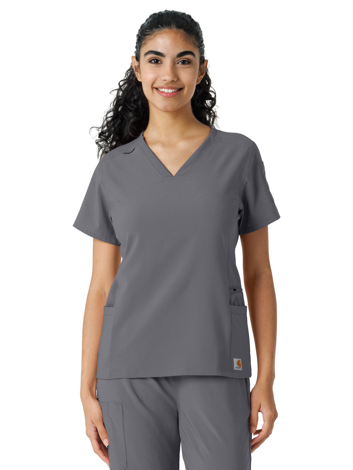 This modern fit scrub top offers a flattering and functional design. The soft knit V-neckline features a convenient badge loop, while multiple pockets provide ample storage: two top-loading pockets at the sides, a secure zip pocket on the left hip, and a double pen pocket on the sleeve. Knit panels on the sides enhance flexibility and comfort, and the slightly curved hem adds a touch of style. With a length of 27 3/4 inches, this pullover top is made from a comfortable and durable blend of 94% polyester and 6% spandex.