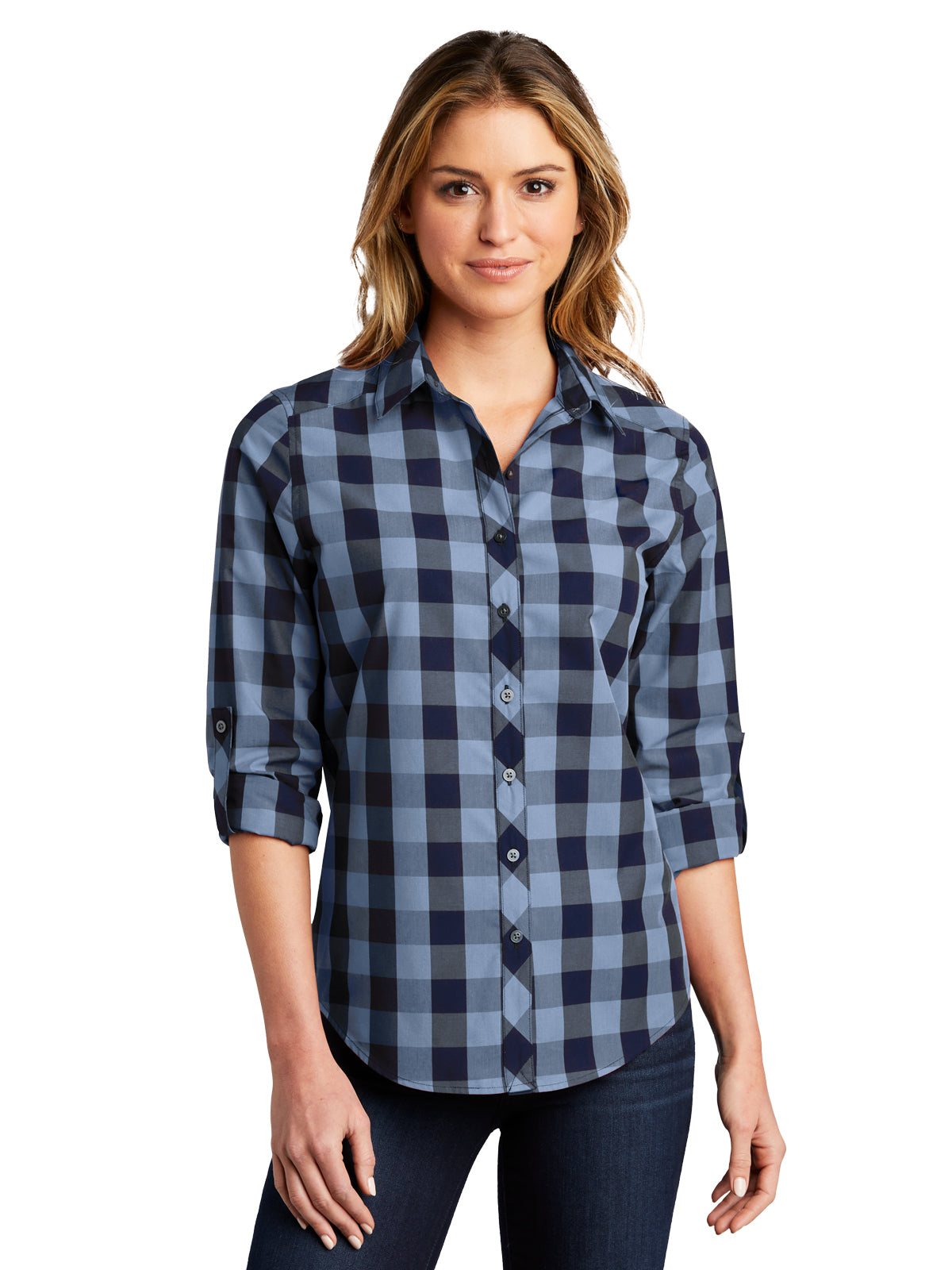 With a traditional buffalo check pattern the lightweight feel of poplin fabric and durable Easy Care features this shirt is something you will want to wear every day. 4.6-ounce 60/40 cotton/poly Bias cut on back yoke Open collar French front Bias cut on center front placket Pearlized buttons Roll sleeves with bias-cut button tabs Curved shirt tail hem