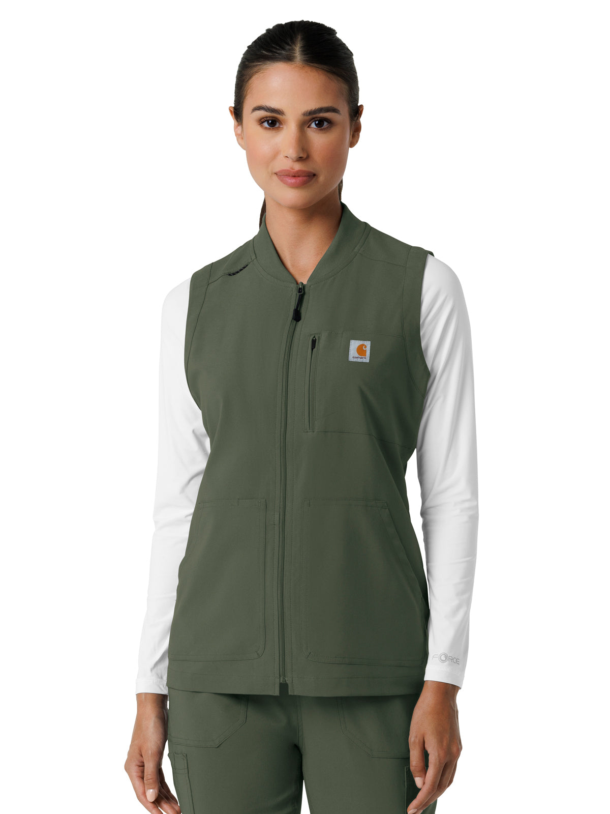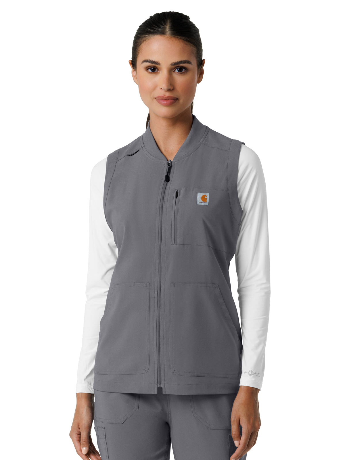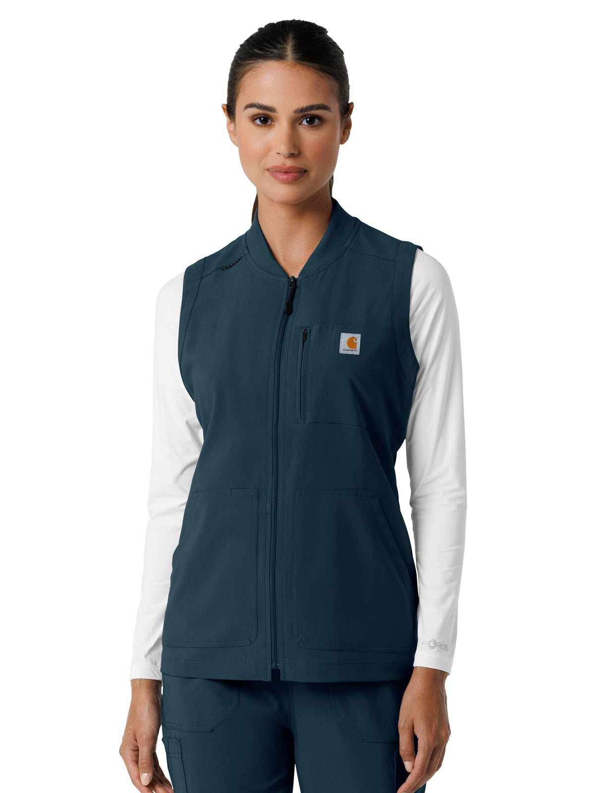 This women's Carhartt scrub vest is designed for the active healthcare professional who values practicality and performance. Built to handle the demands of a busy workday, this vest prioritizes utility and functionality. Utilizing Rugged Flex™ stretch technology, it provides exceptional flexibility, allowing for unrestricted movement during demanding tasks. A key feature is the mesh-lined back vent, which promotes airflow and helps regulate body temperature, keeping you cool and comfortable throughout your shift. The vest is equipped with ample pockets, strategically placed to safeguard all your essential notes, supplies, and personal items. Notably, a dedicated space is provided for your stethoscope, ensuring this crucial tool is always readily accessible. This scrub vest is more than just an outer layer; it's a functional tool designed to enhance your efficiency and comfort. The durable construction and thoughtful design details make it a reliable choice for professionals who need a vest that can keep up with their demanding schedules. It's an ideal addition to any healthcare professional's wardrobe, providing both practicality and comfort.