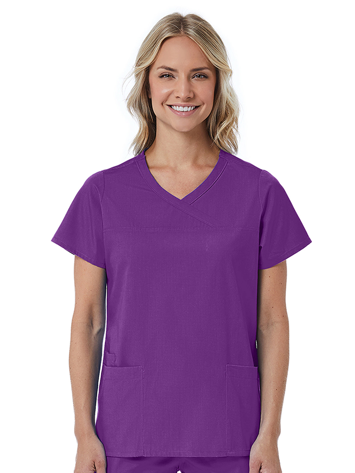 Maevn's Red Panda Brand features classic styling with a superior soft touch. The fabric is engineered to provide long-lasting durability, while maintaining an exceptionally soft, amazingly light feel. Each style is tailored to create a look that is both polished and professional. The Curved Mock Wrap Top features a front yoke with double needle stitching, two front patch pockets with an inner patch pocket, and an inner utility loop at the pocket.