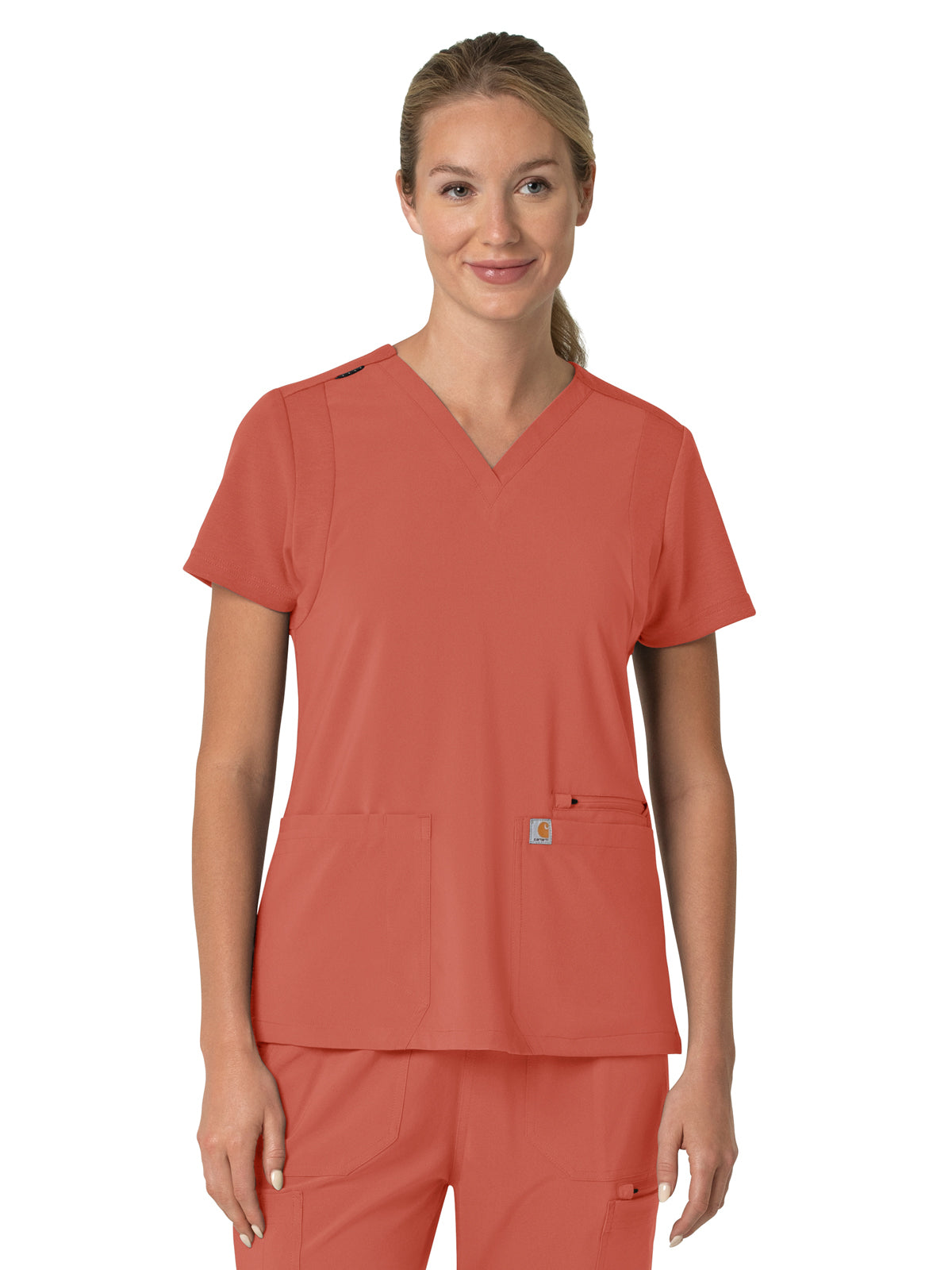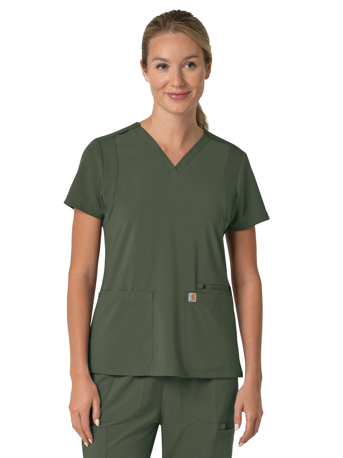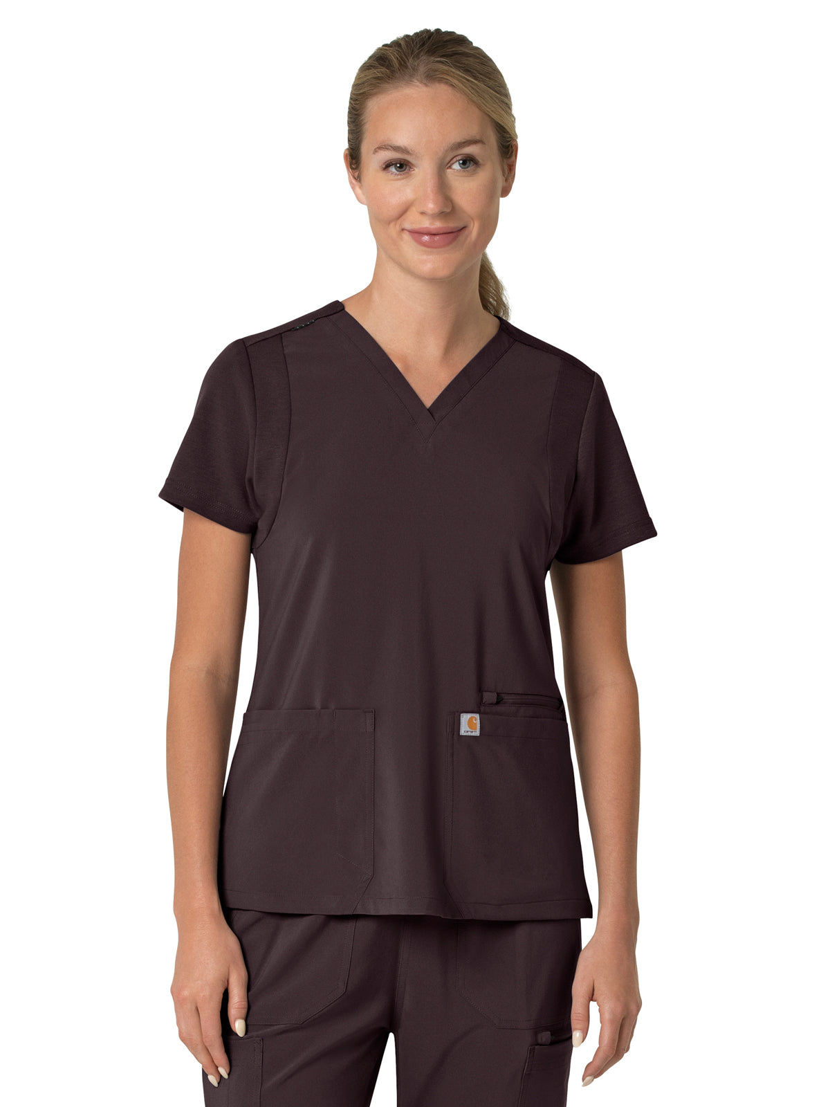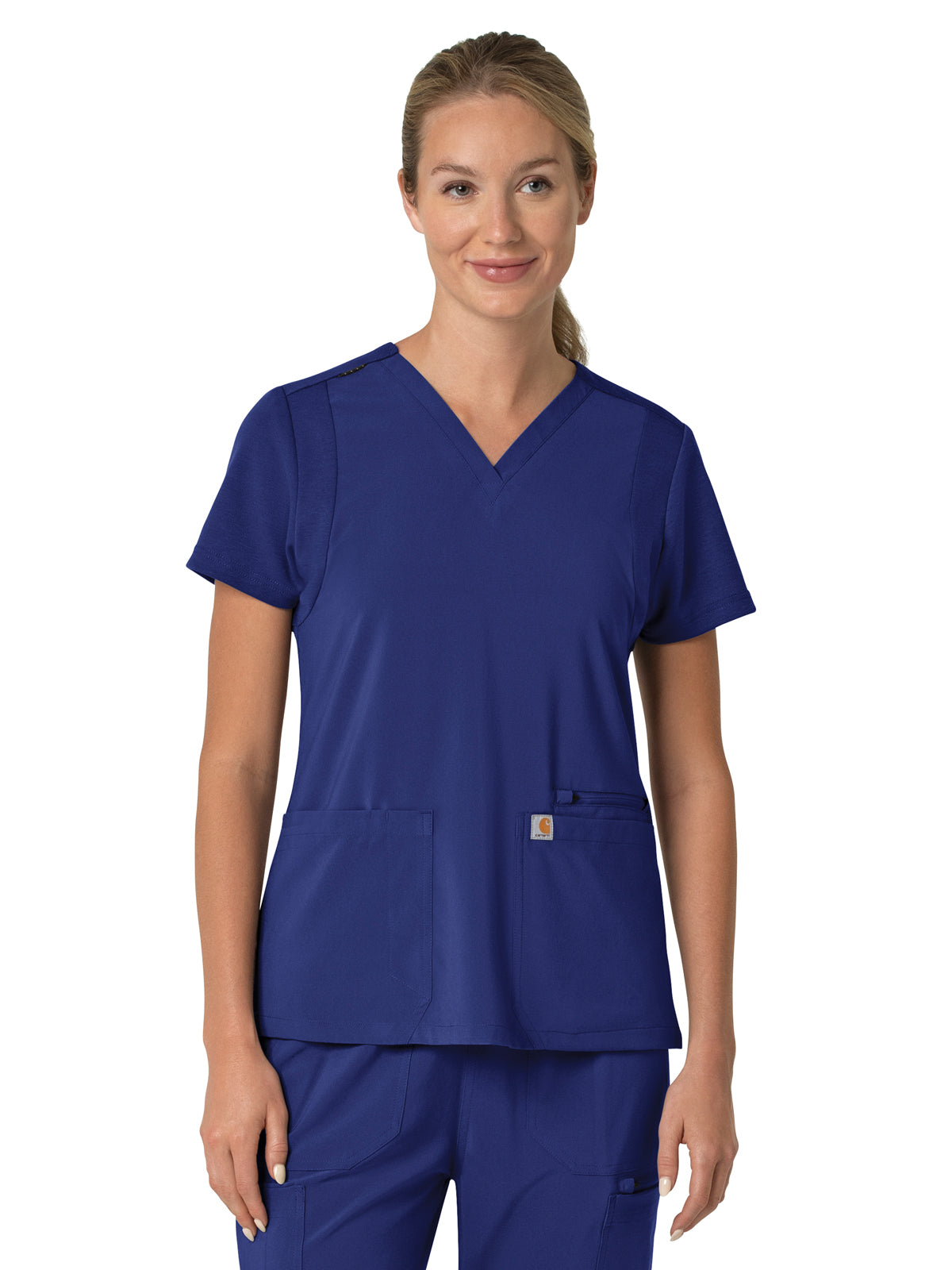 This women's modern fit scrub top features rib knit fabric at shoulders and sleeves as well as the racerback detail to allow for ease of movement, badge loop at wearer's right shoulder, 2 large front patch pockets have a spot for a pen on the right and smaller zipped cell pocket on the left, and side vents for ease of movement around the hips. Body length (Size M): 27 1/4". Stretch dobby fabric: 94% Polyester, 6% Spandex.