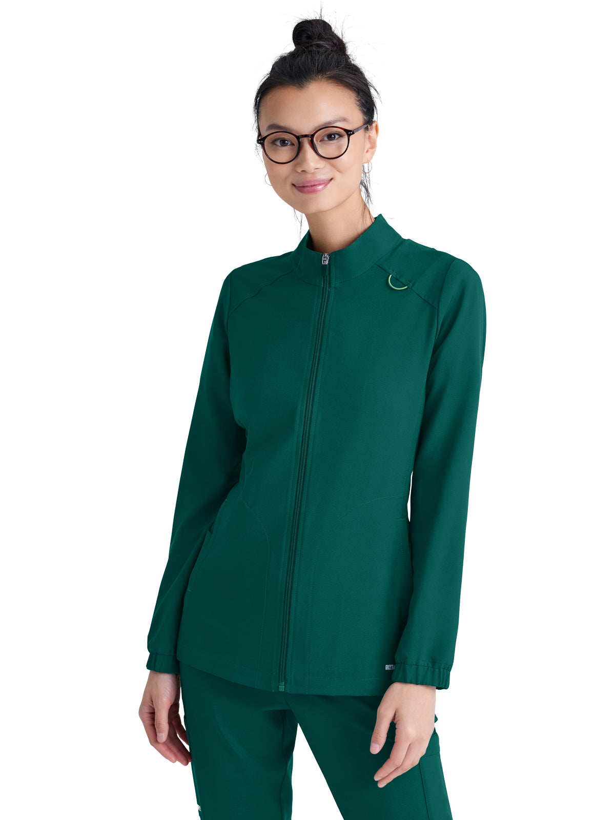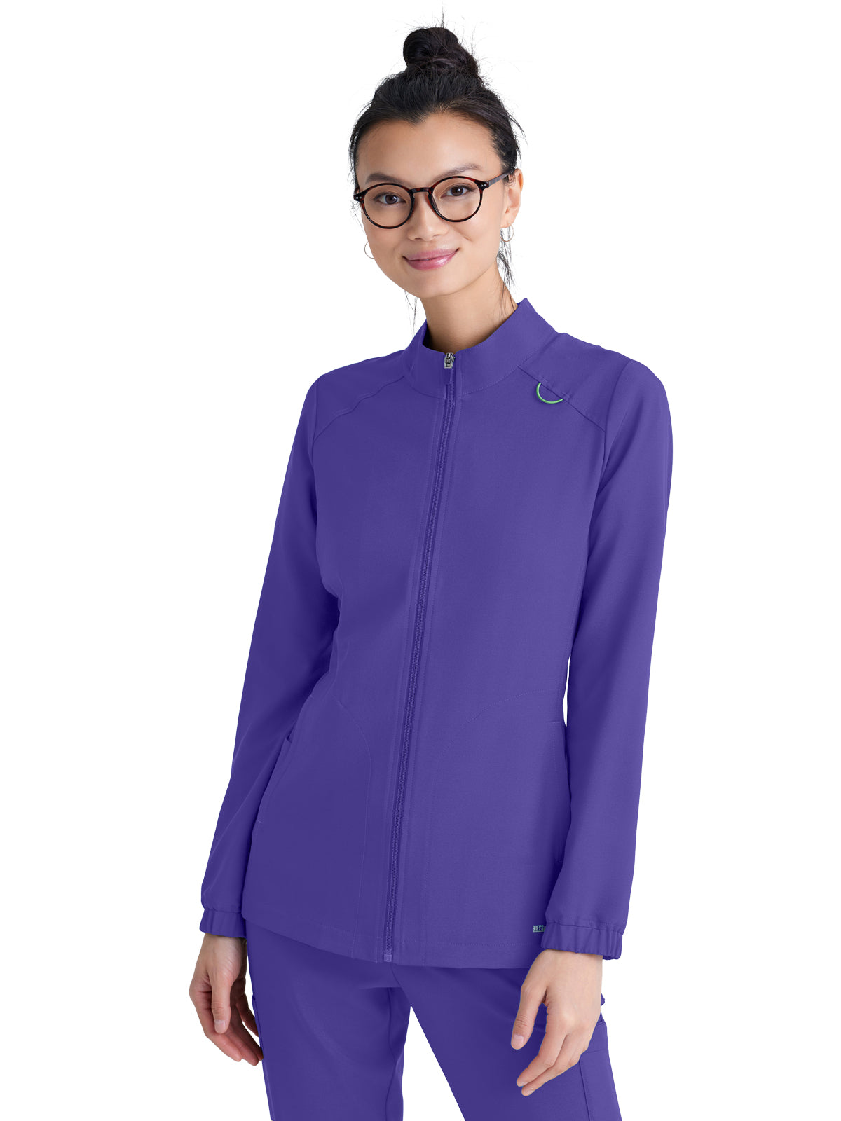 Complete your favorite Grey's Anatomy by Barco Evolve scrub set with this modern warmup. The athleisure-inspired jacket features two spacious pockets and a signature green badge loop to keep important items close by. Made with sustainable fabric, this soft, stretchy jacket wicks away moisture to keep you comfortable all day.