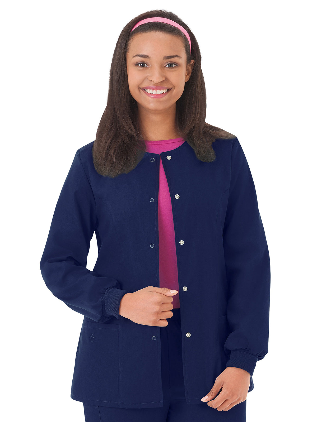 - LOOK AND FEEL GREAT: Fundamentals Scrubs are designed to make you feel good while working the long shifts. This warm-up jacket combines a round neckline and stitching details for a universally flattering look without sacrificing comfort. 2 deep patch pockets allow one to store whatever the day's necessities may bring. Color matching knit cuffs and snap front closure allows ease of movement in this trendy jacket. The center back length of this scrub jacket is 28”.